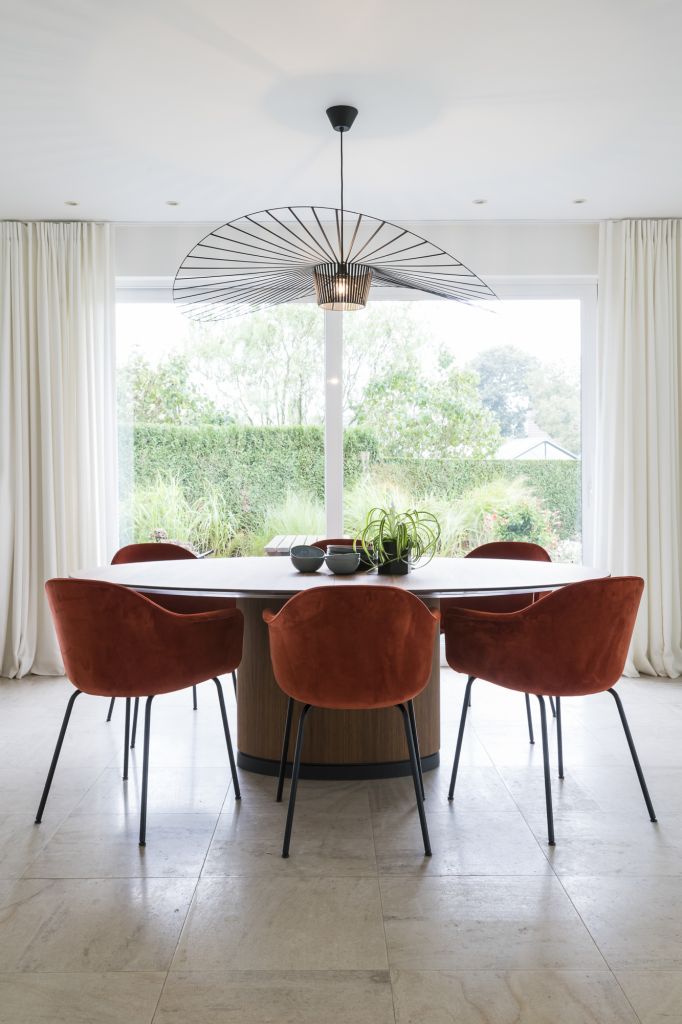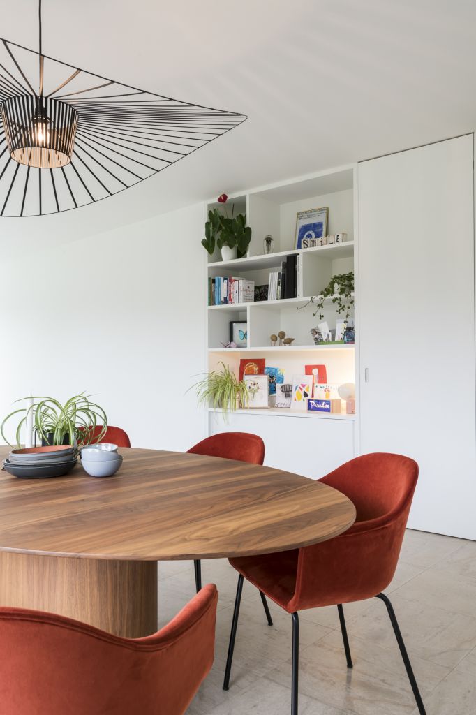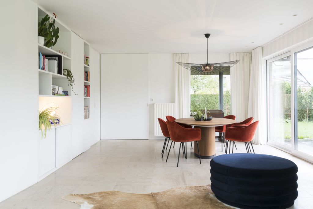 Dit gezin met 3 kinderen schakelde Goûts et Couleurs in om hun leefruimte met nieuwe uitbouw tot 1 geheel aan te kleden. Zo mochten we instaan voor inrichting van de volledige leefruimte: de eetruimte, piano/lounge hoek en de zitruimte met de haard en daarachter verscholen hun bureau. Nauw contact met elkaar is er zeer belangrijk, maar toch kan ieder in deze ruimte zijn plekje claimen.